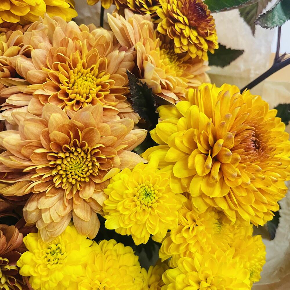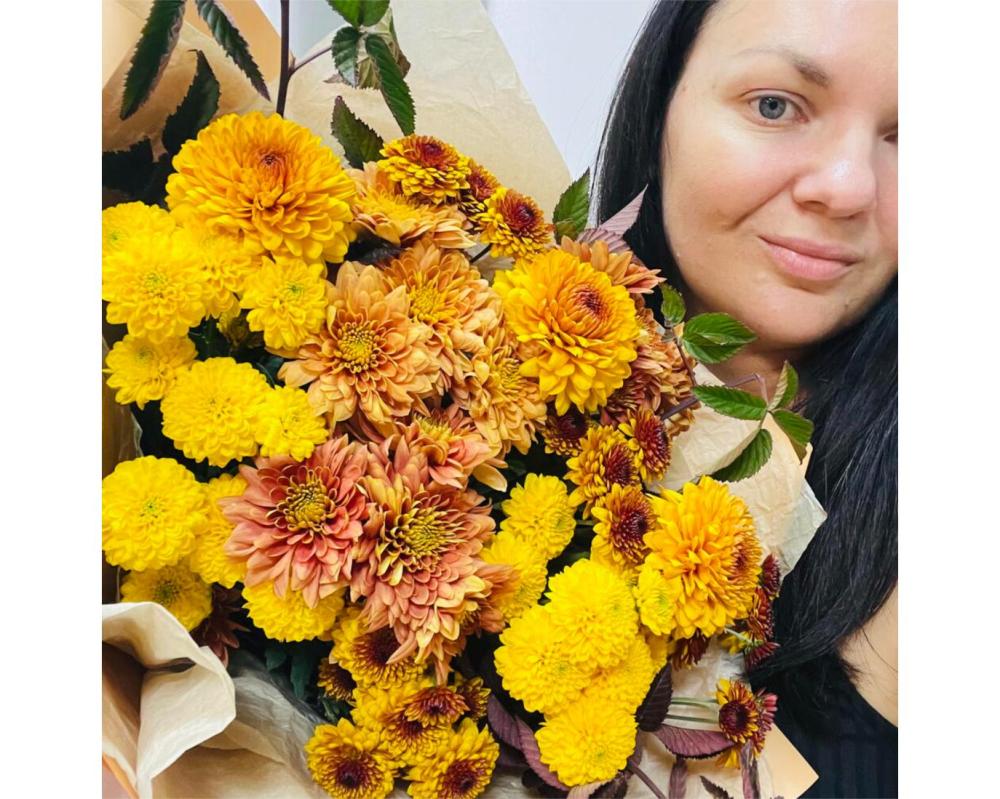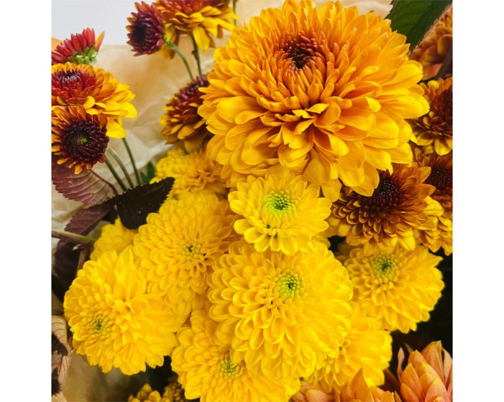 Осенний букет с рыжими шариками хризантем и красными листьями