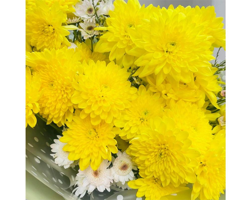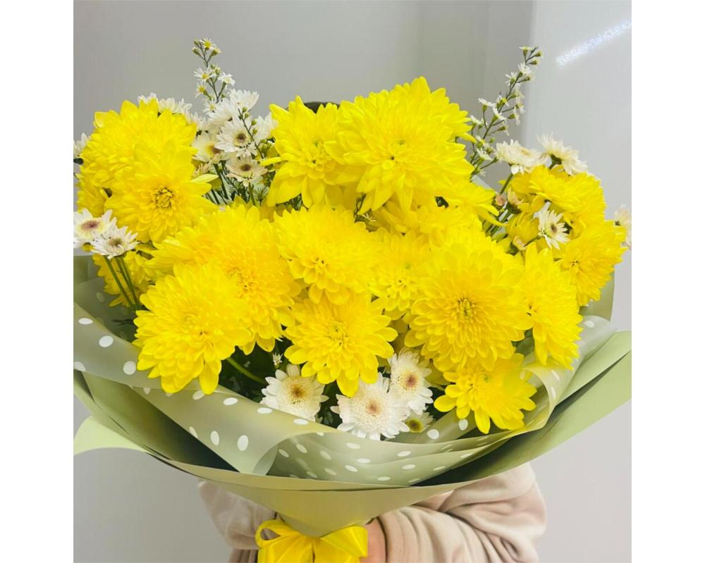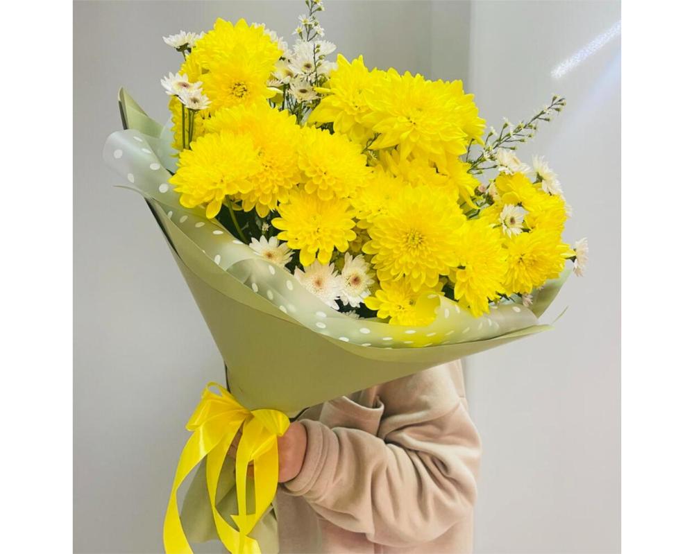 Букет с желтой хризантемой и ромашкой