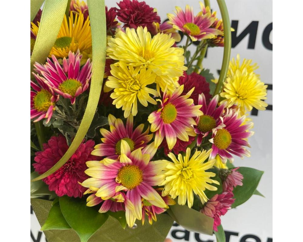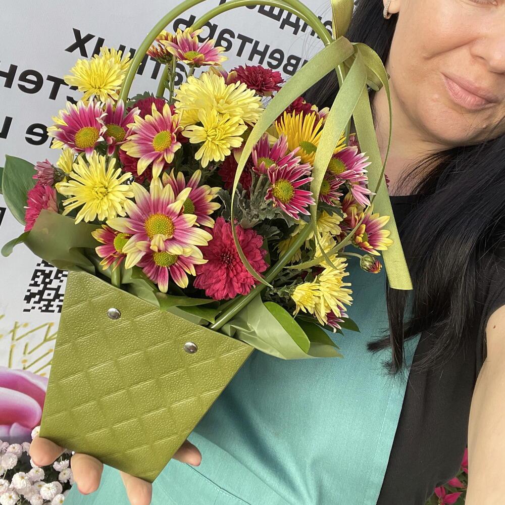 Осенняя композиция (букет) с садовой хризантемой в сумочке