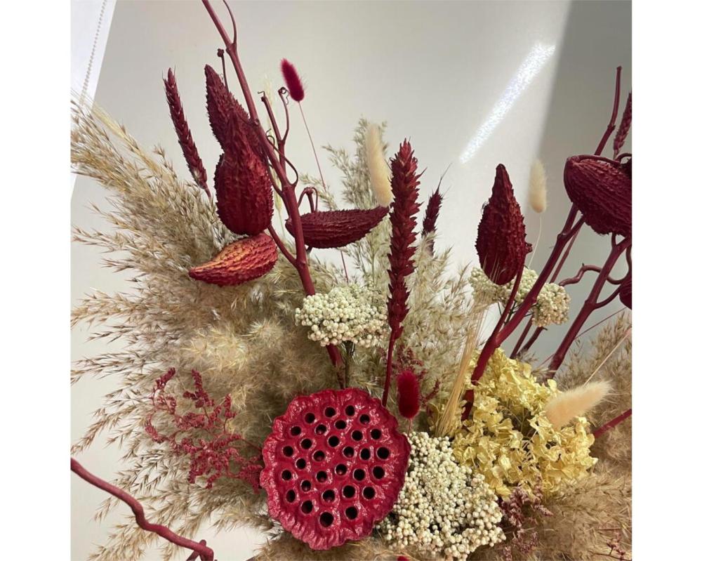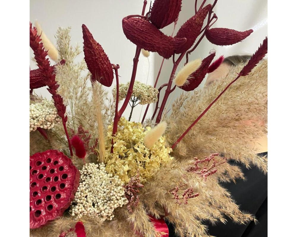 Яркая большая композиция из сухоцветов и лагуруса в белой шляпной коробке