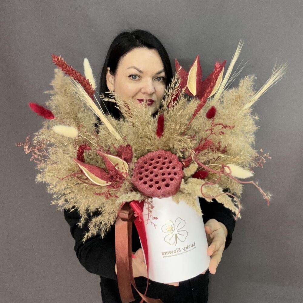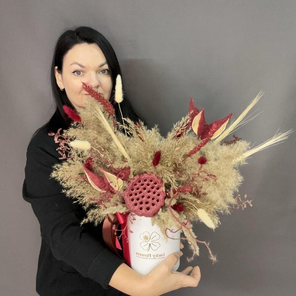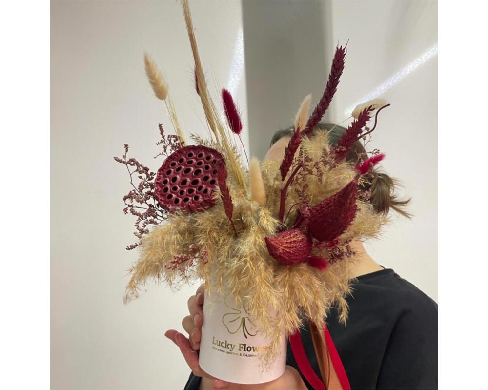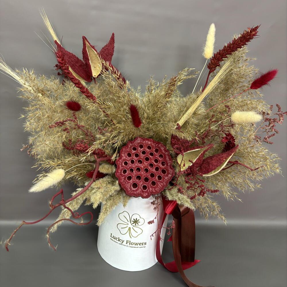 Композиция с лагурусом в белой шляпной коробке