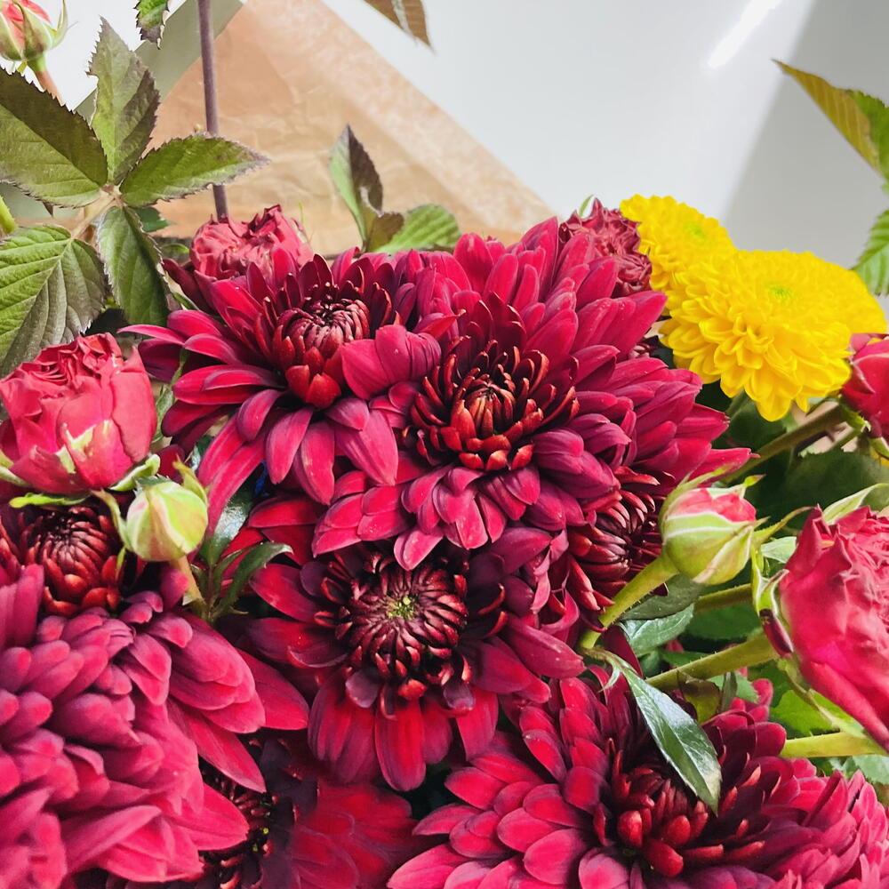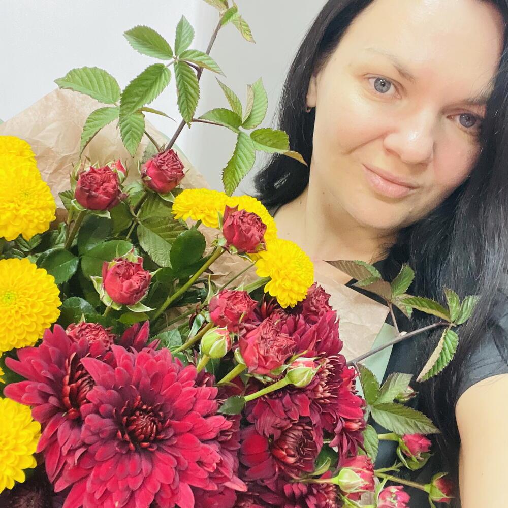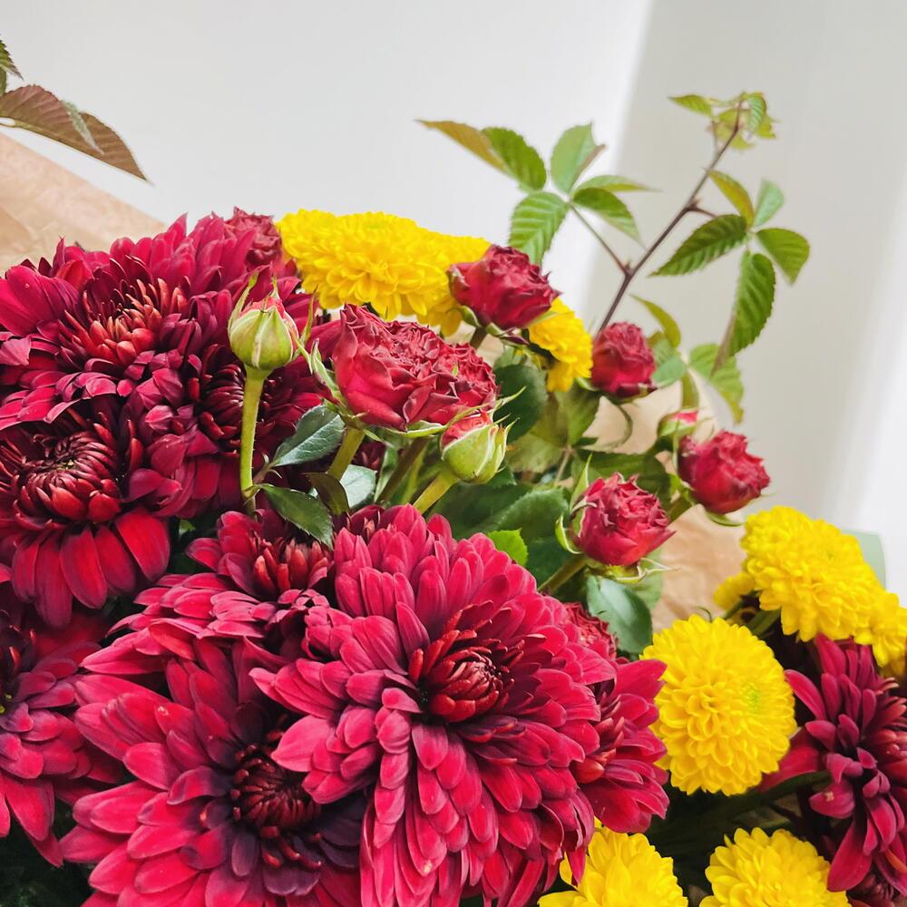 Букет «Осеннее великолепие» с кустовой пионовидеой розой, ароматной хризантемой и яркими листьями