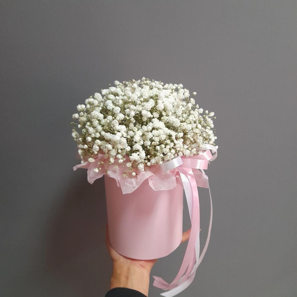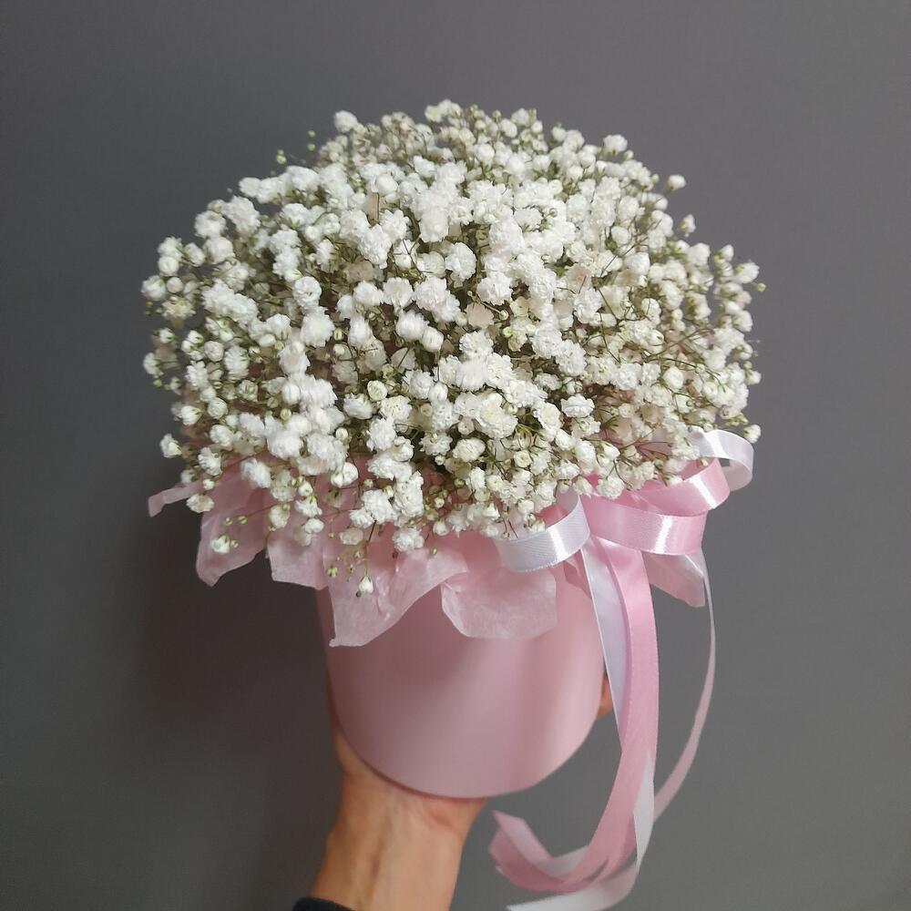 Композиция в шляпной коробке из белой гипсофилы для мамы
