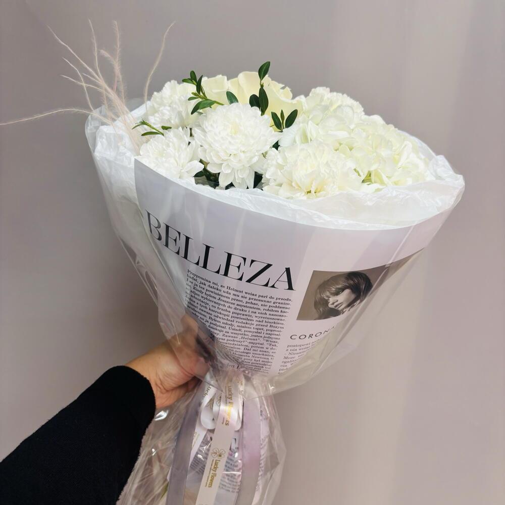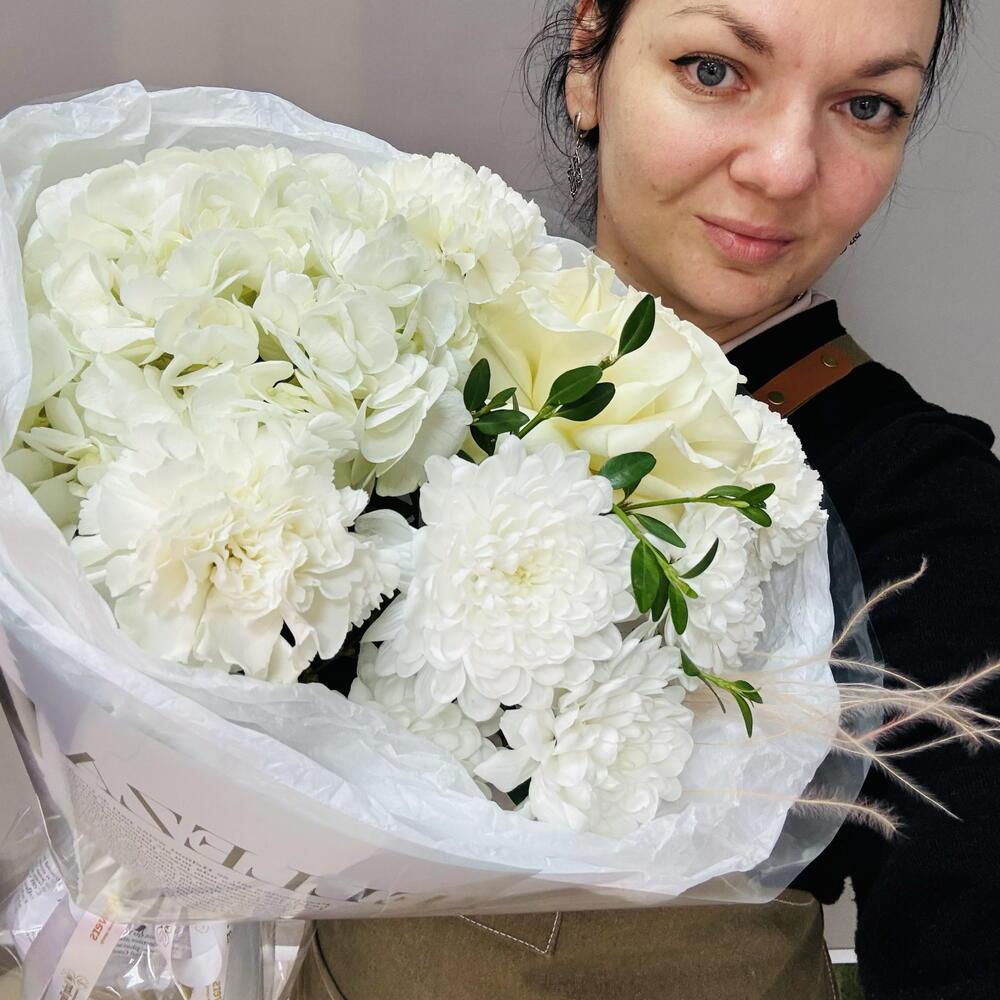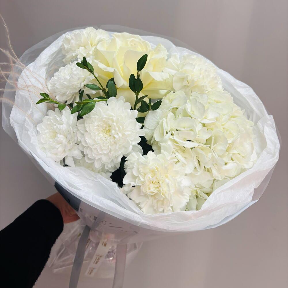 Белый букет с французской розой, гортензией и ароматным диантусом