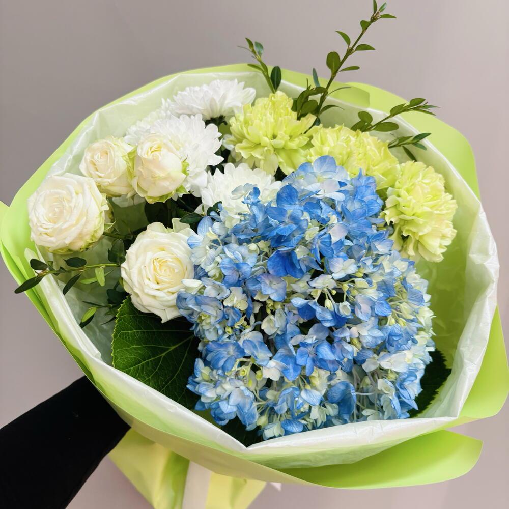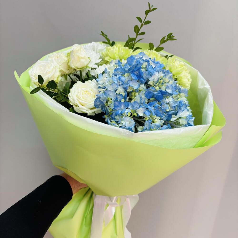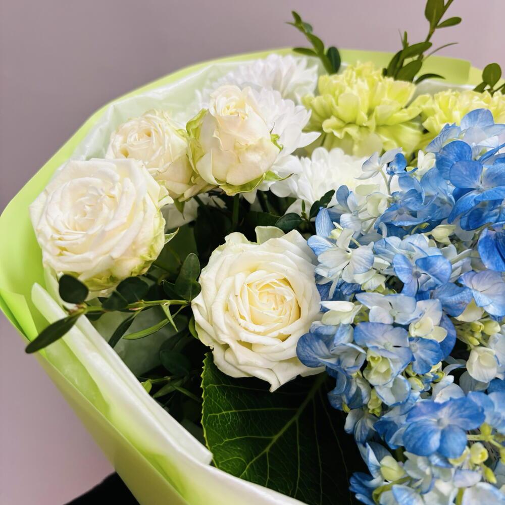 Сочный букет с гортензией и белой кустовой пионовидной розой