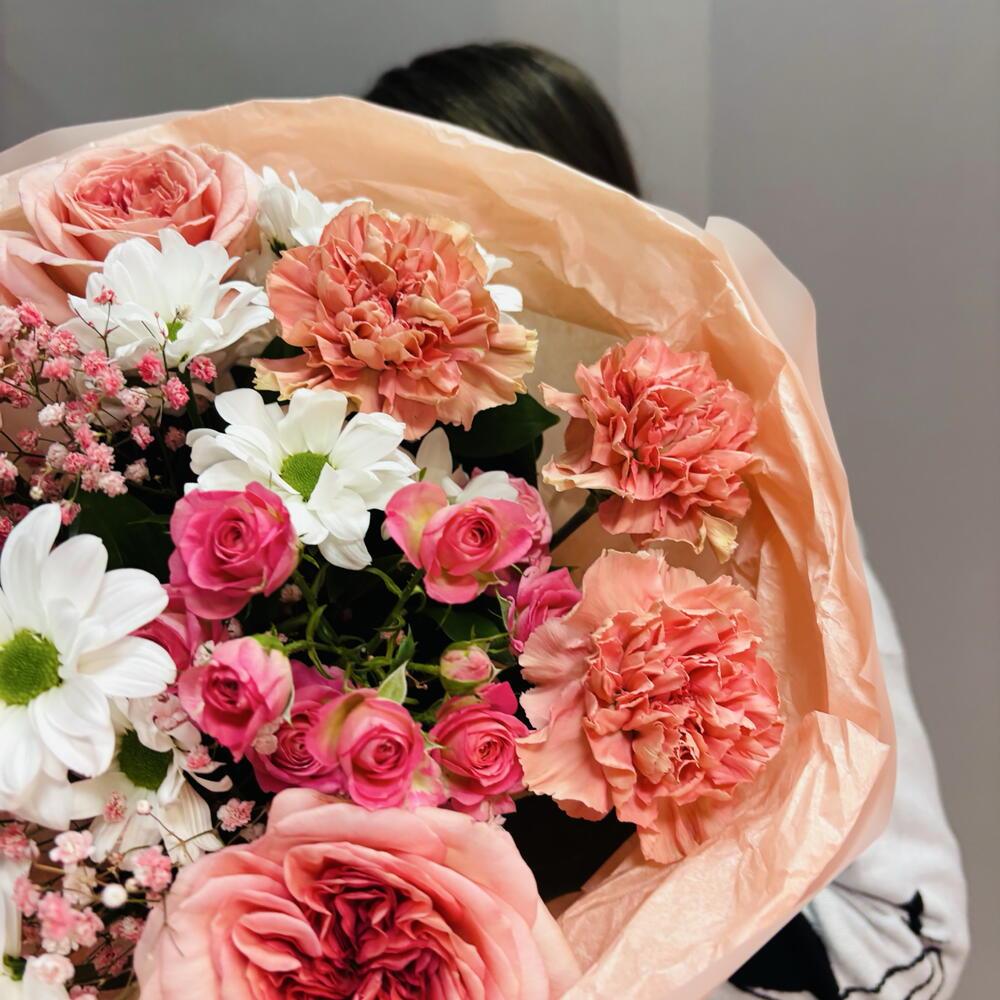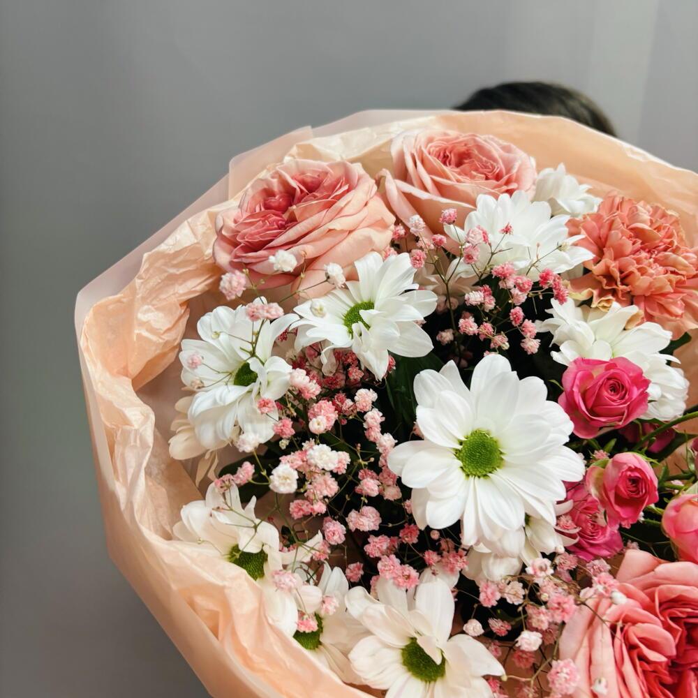 Круглый букет с пионовидной розой в персиковых оттенках