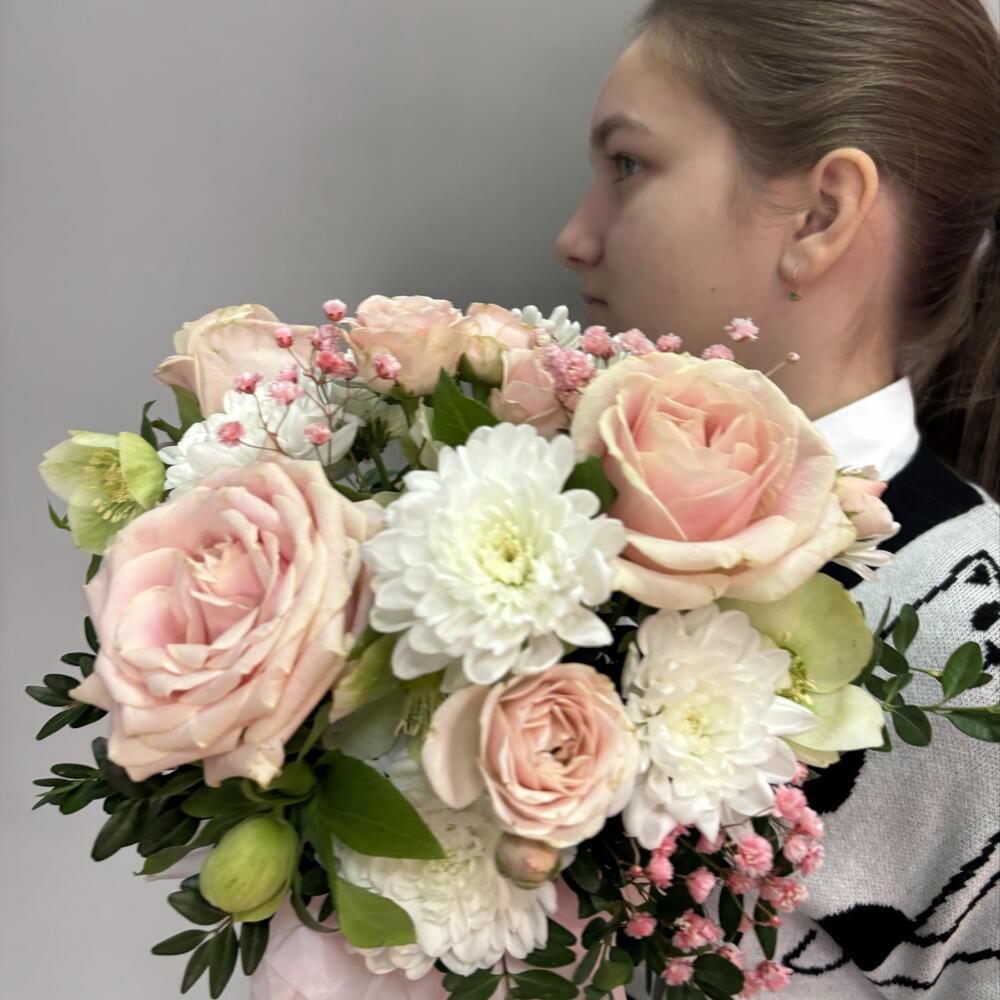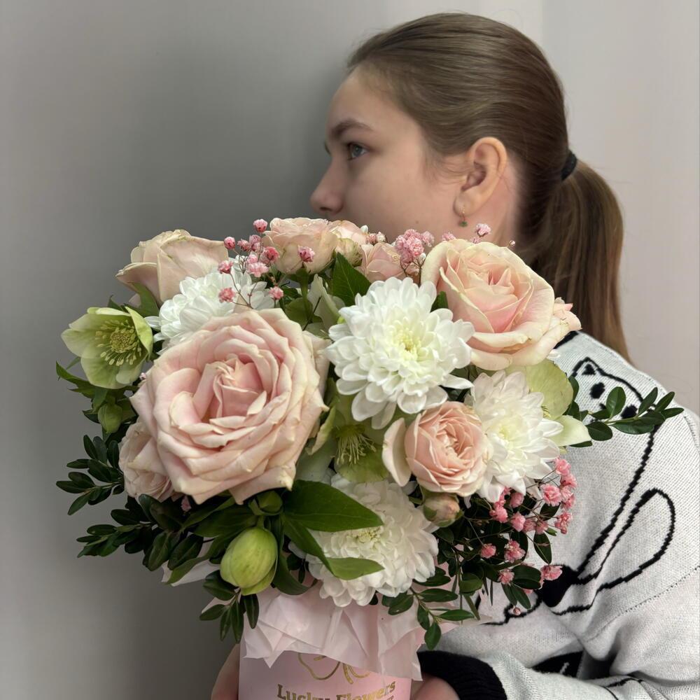 Нежная цветочная композиция с первоцветами в шляпной коробке