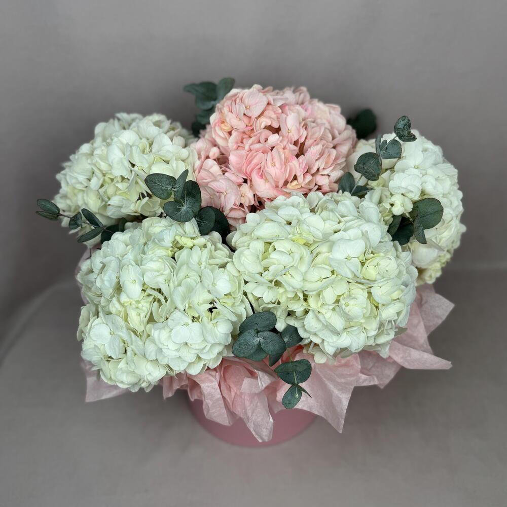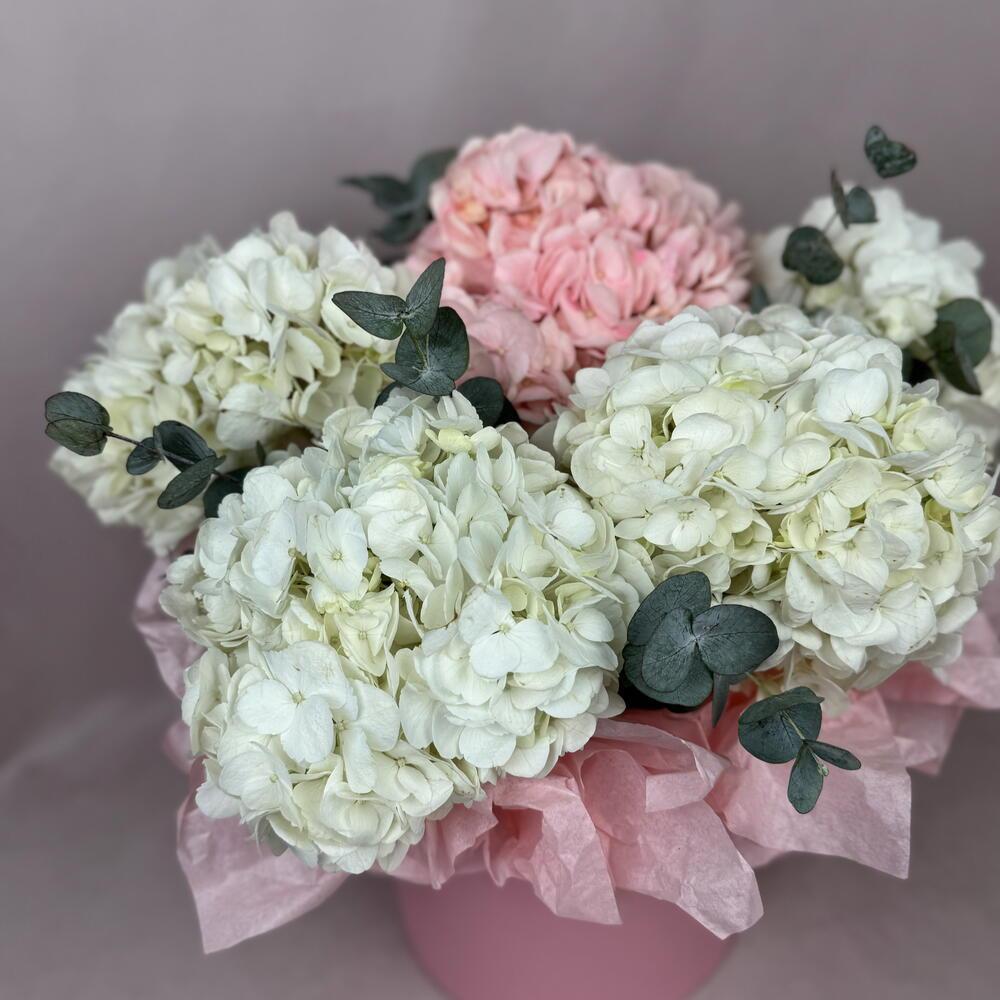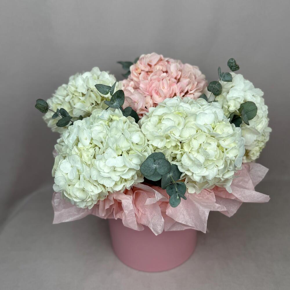 Роскошная композиция в розовой шляпной коробке с гортензиями и эвкалиптом