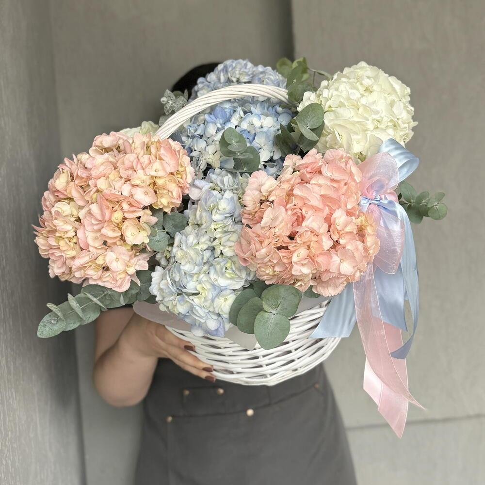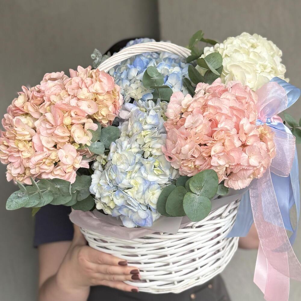 Гортензия в корзине. Композиция из голубых, розовых и белых гортензий. 💞