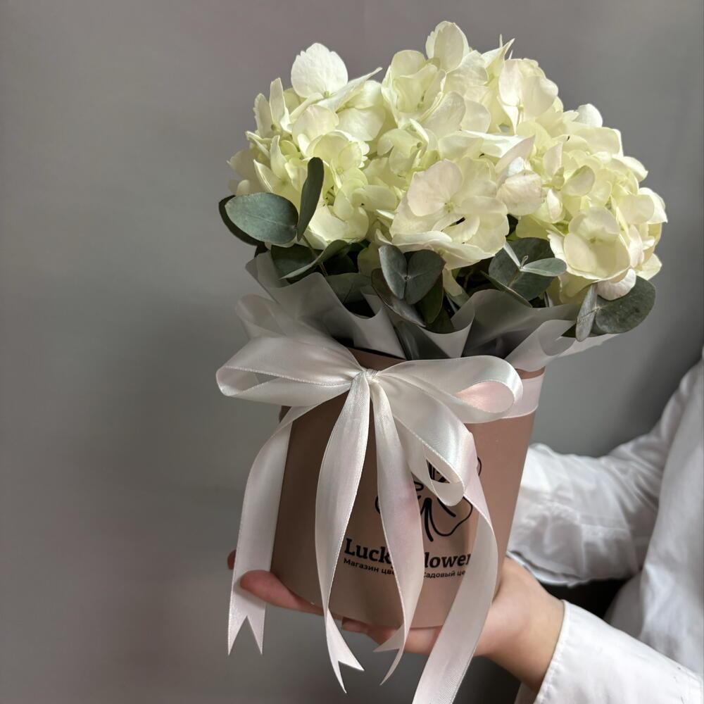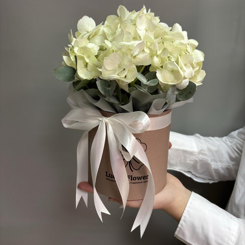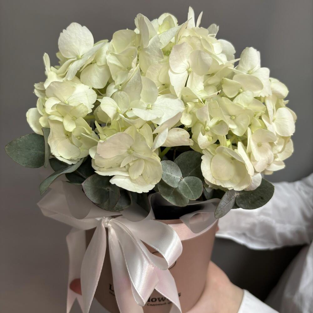 Гортензия в шляпной коробке с ароматным эвкалиптом в подарок на 8 марта, Международный женский день.