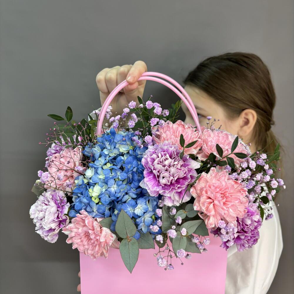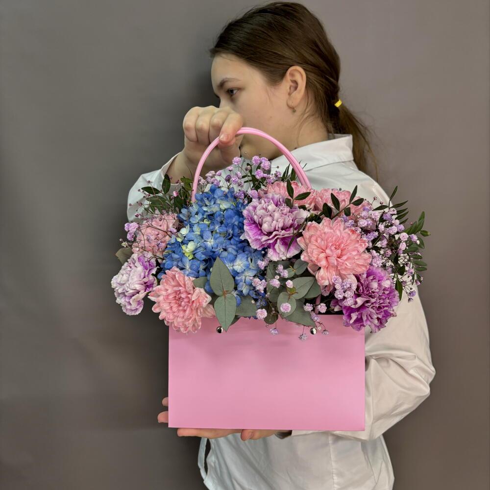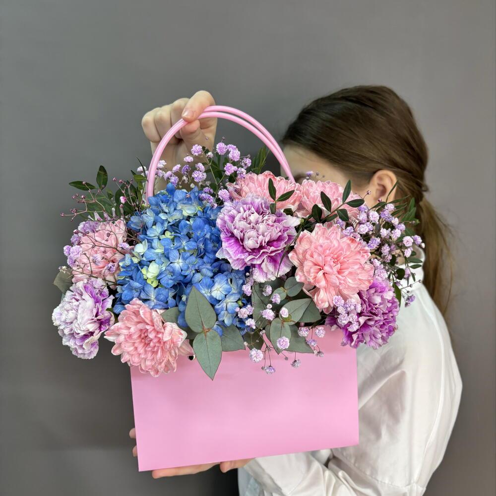 Букет в большой сумочке с ароматным эвкалиптом, диантусом и гортензией