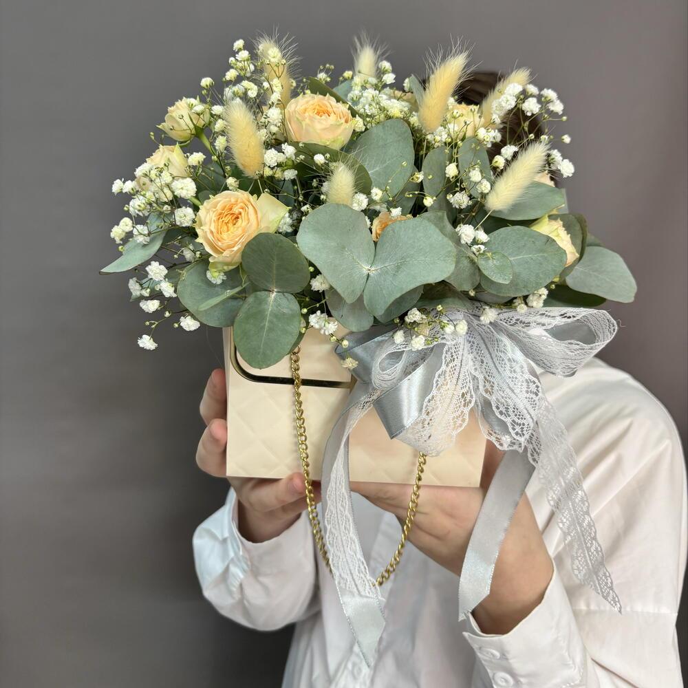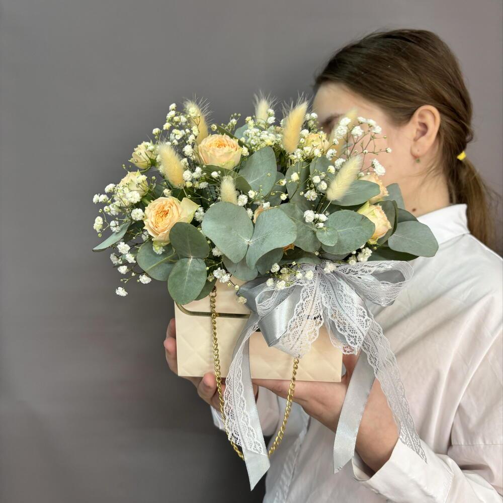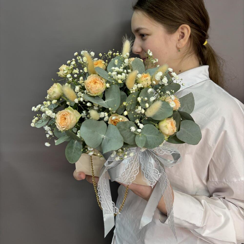 Кустовая пионовидная Роза и ароматный эвкалипт в букете с авторским оформлением