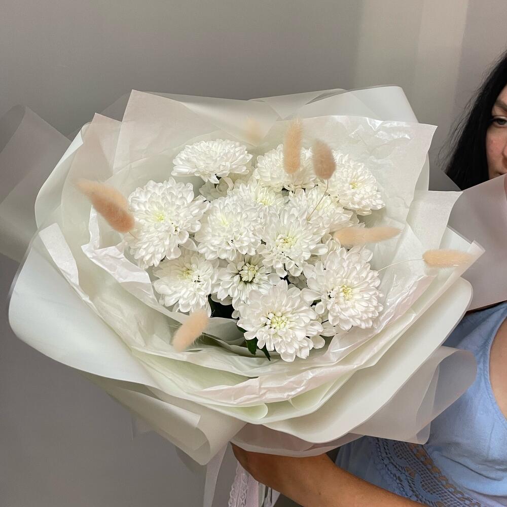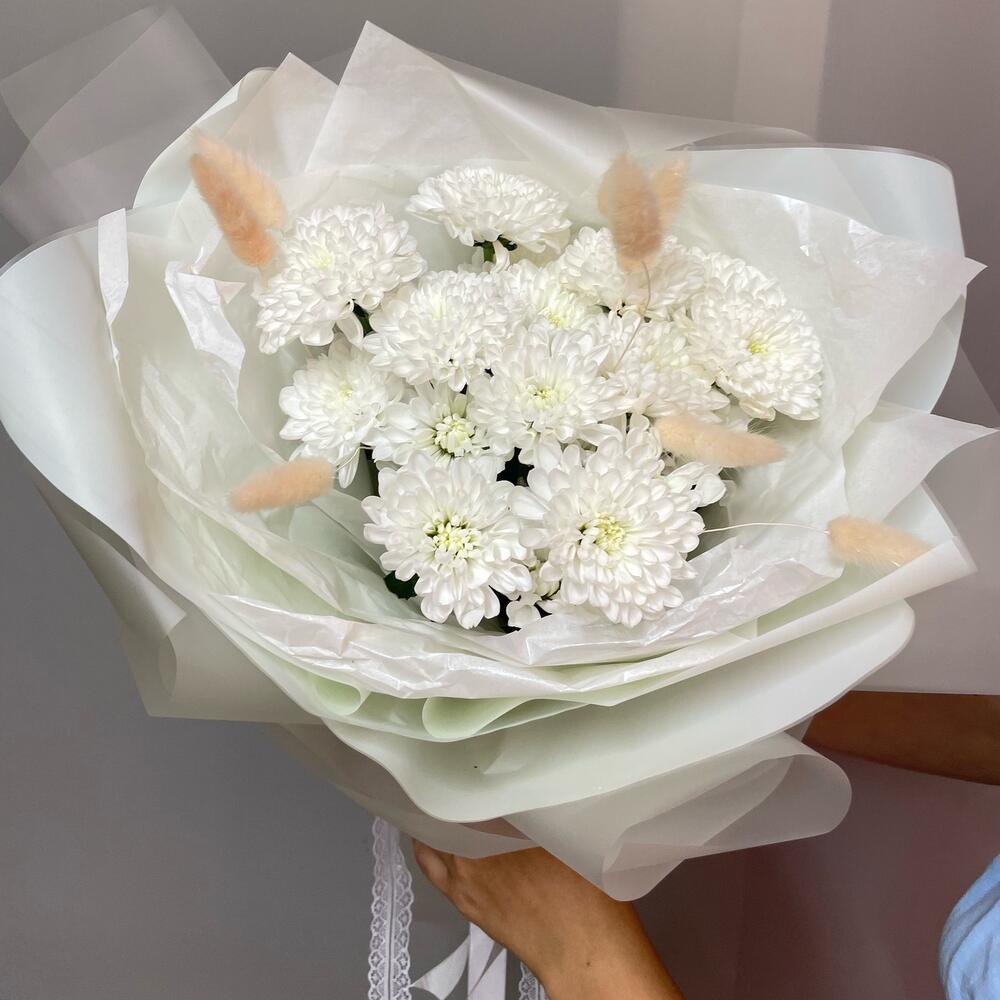 Букет "Пушинка" из белой хризантемы Алтай и пушистиков