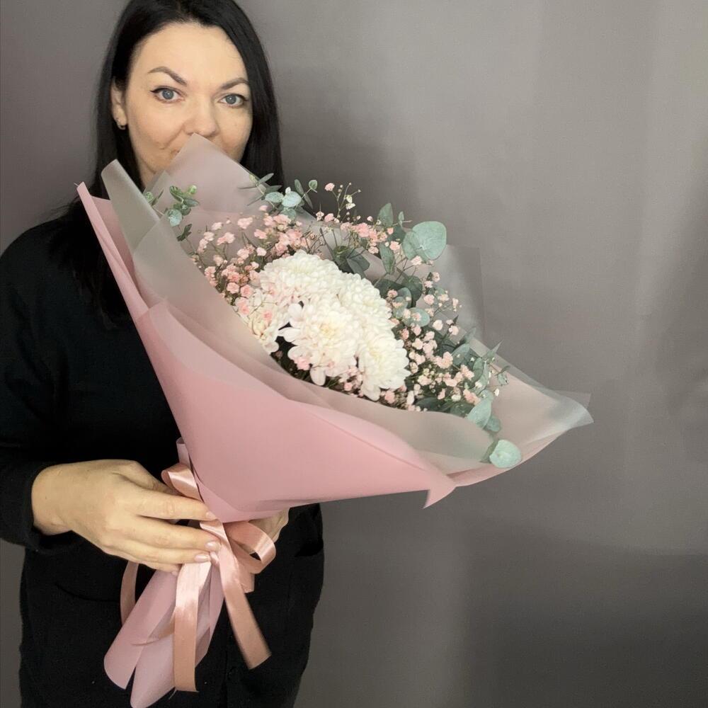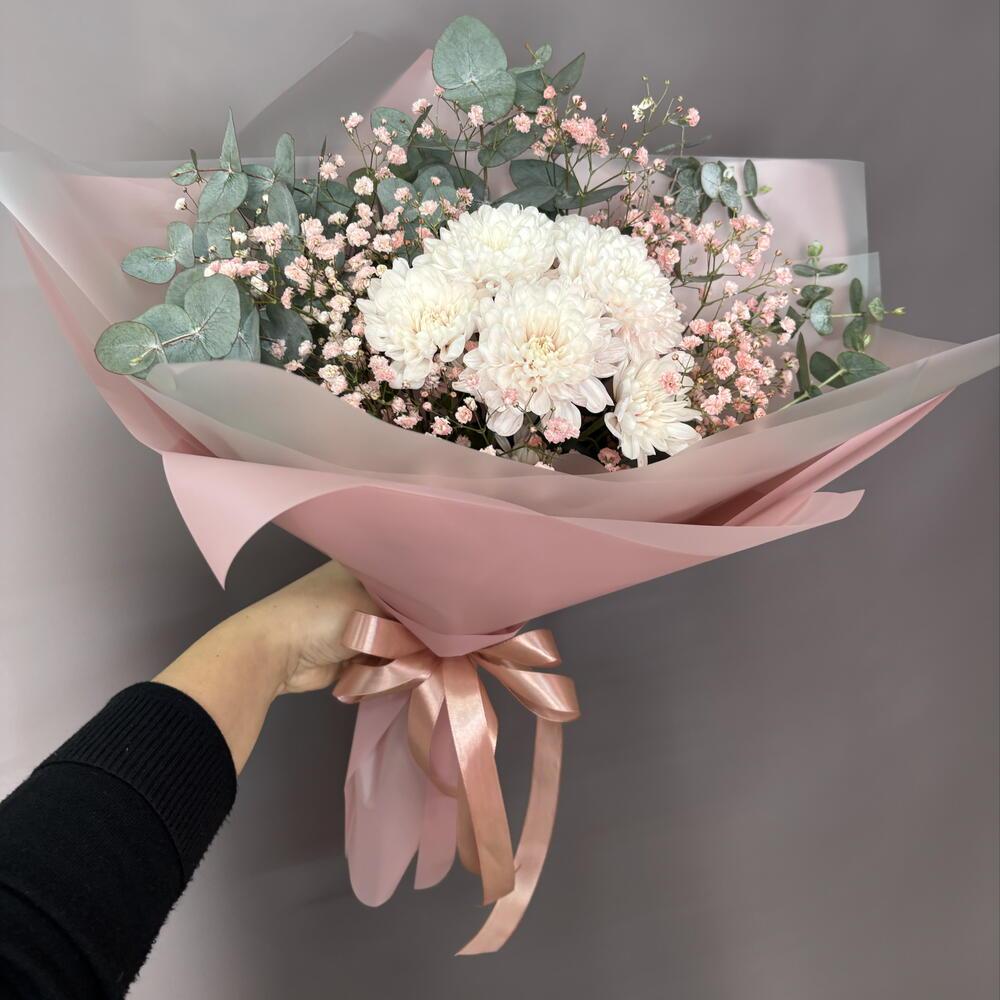 Букет с хризантемой, гипсофилом и ароматным эвкалиптом к празднику 8 марта