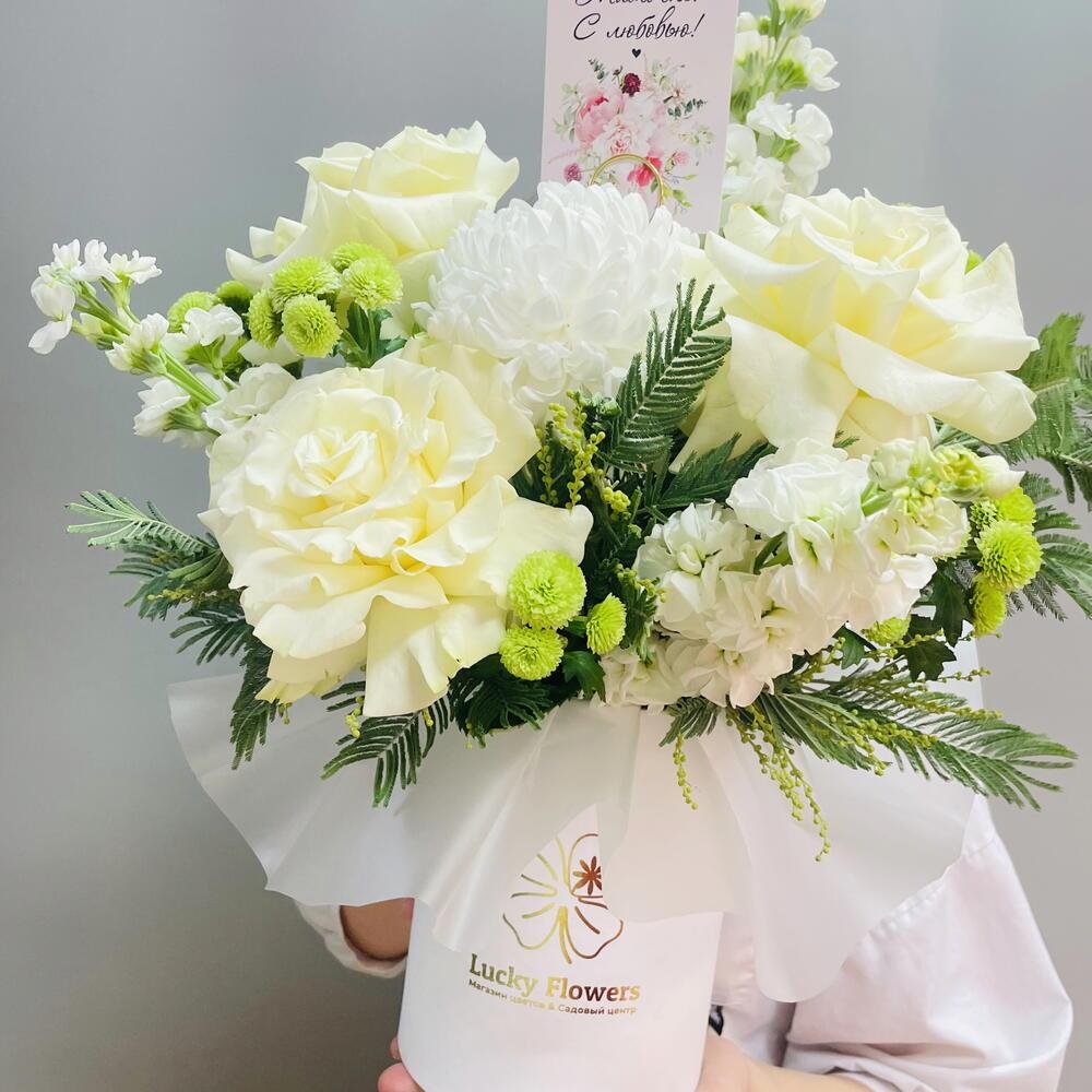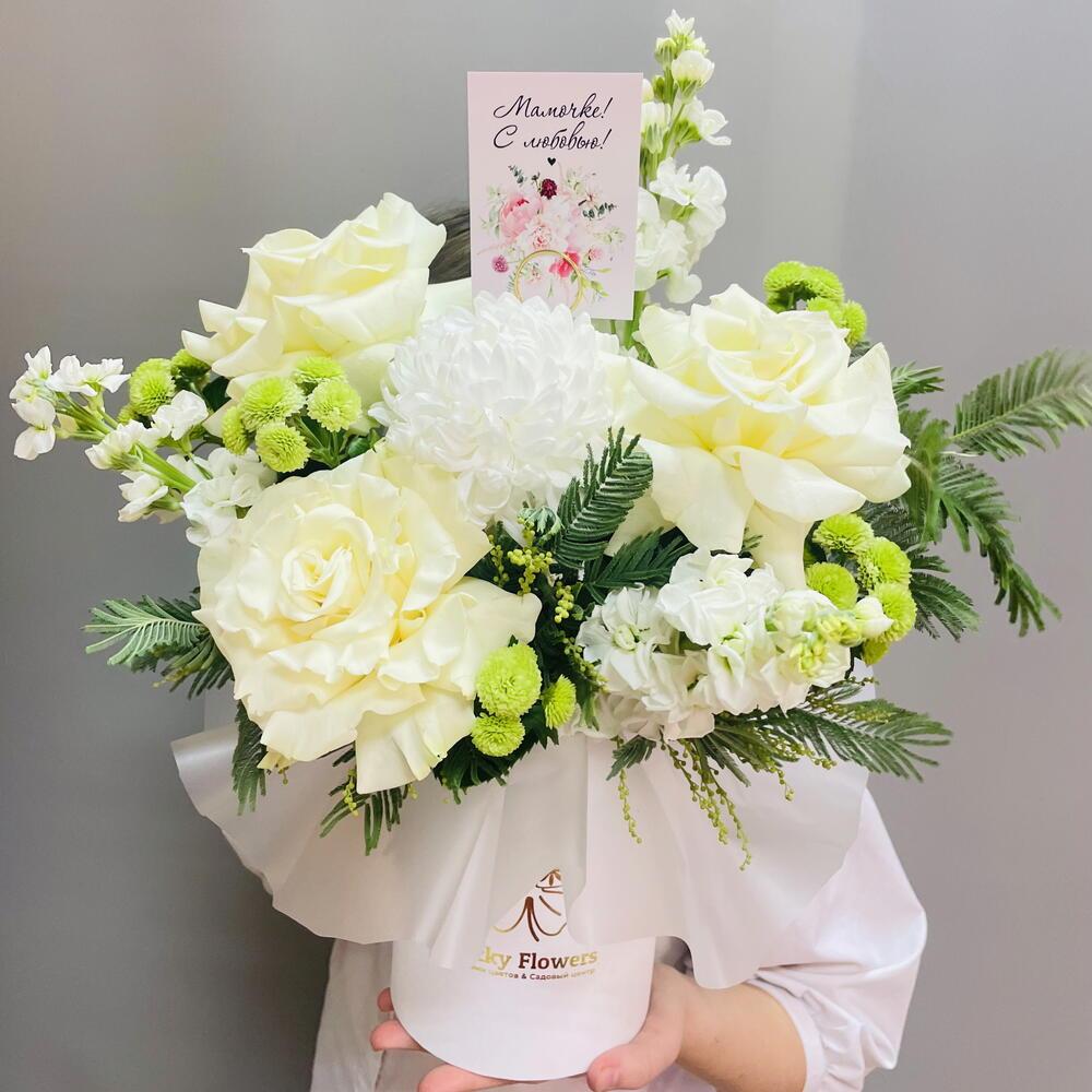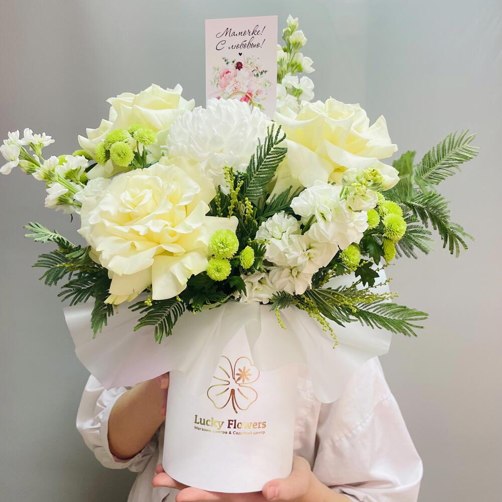 Мамочке с любовью! Композиция с белыми розами и ароматной махровой маттиолой в шляпной коробке